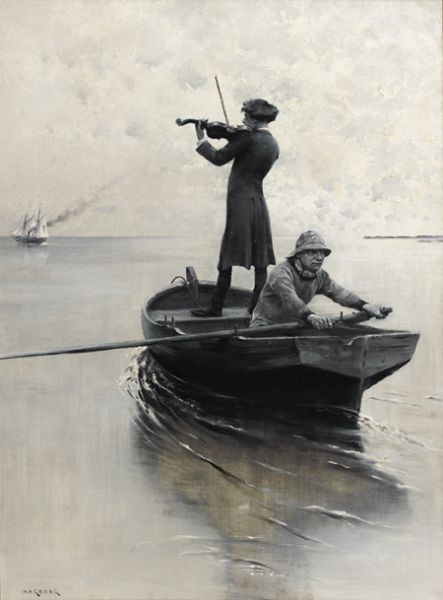 | Violoniste rejoignant un navire, en grisaille | |