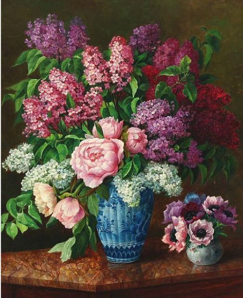 | Still life with lilacs, peonies and French anemones in two vases | |