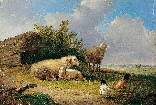 LANDSCHAFT MIT SCHAFEN UND HÜHNERN