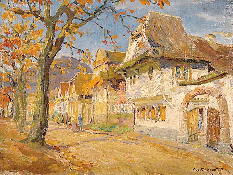| Blick auf herbstliche Dorfstraße in Rhodt, verso auf Keilrahmen betitelt | |