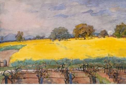 Blick vom Fuße eines Weinbergs über ein blühendes Rapsfeld.