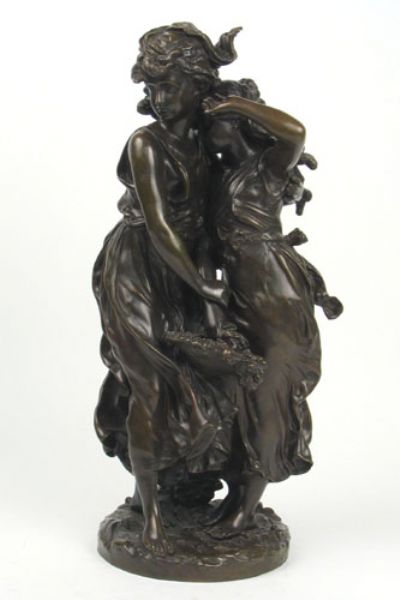 | Two young barefoot women, one shy with uplifted arm, the other with basket of flowers. | |