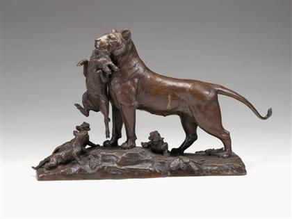 | Bronze medium brown patina, modeled as a tigress standing with a boar in her jaws, her three cubs at her feet | |