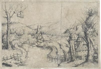 | Landscape with a wining wooden Bridge, a village in the background Hintergrund ein Dorf | |