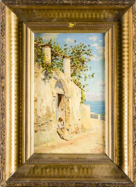 Junge an der Pforte eines Hauses auf Capri mit Ausblick aufs Meer
