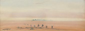 | Figures resting in the desert at dusk, a town beyond; and A train of figures and camels moving through the desert | |