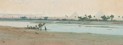 | Resting on the banks of the Nile with the Pyramids beyond | |