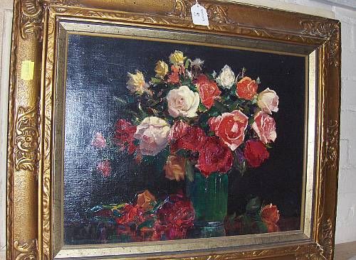 Still life of roses in a green vase,