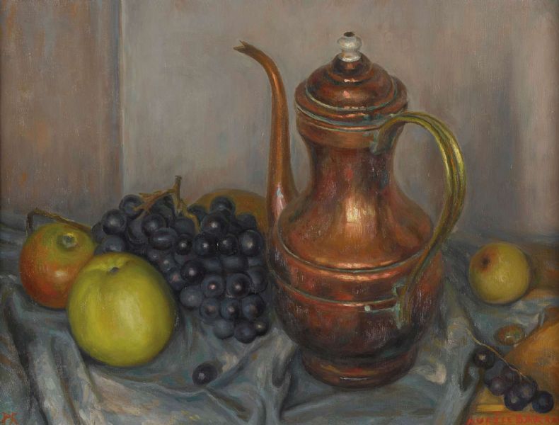 Stillleben mit Kupferkanne, Trauben und Äpfeln.