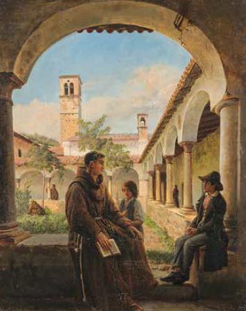 Mönch mit zwei Kindern im Kreuzgang des Kapuzinerklosters von Lugano