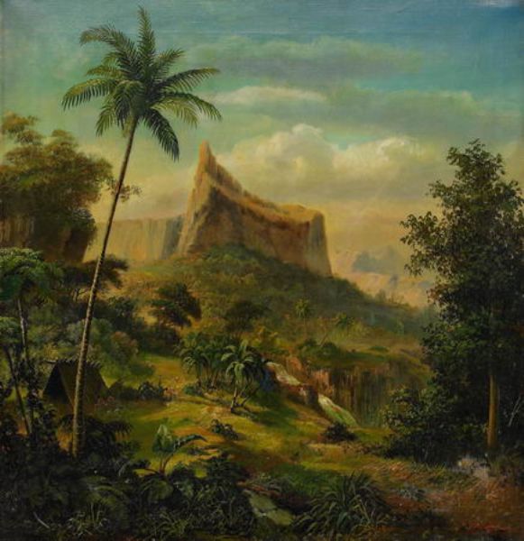 Söderhavsmotiv med hydda och palmer