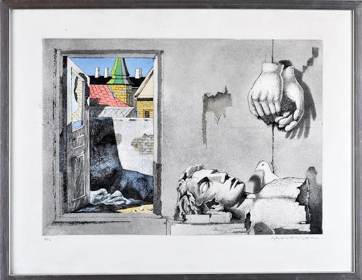 | Surrealistiskt komposition med grått rum med skulpturer mot öppen dörr till färgglad stad | |