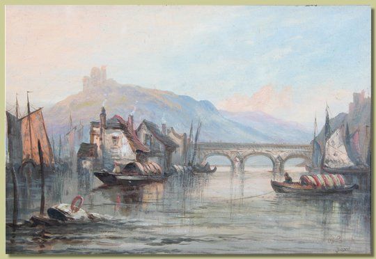 | Continental river scene with boats in the foreground, arched bridge and hilltop castle beyond | |