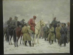 stern encounter between Cossacks and foot soldiers in a snowy landscape
