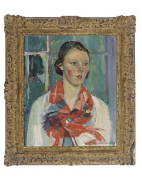 | Portrait of a lady, quarter-length,in a white cardigan and red scarf | |