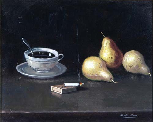 Stilleben mit Kaffeetasse, Birnen und brennender Zigarette