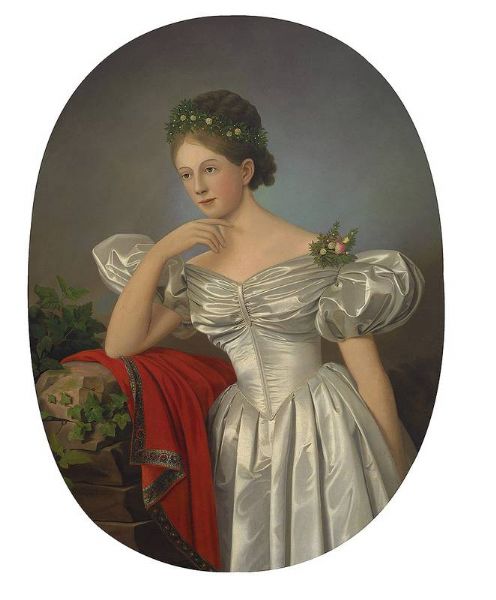 Portrait einer jungen Frau im Brautkleid mit Myrtenkranz vor abendlicher Landschaft