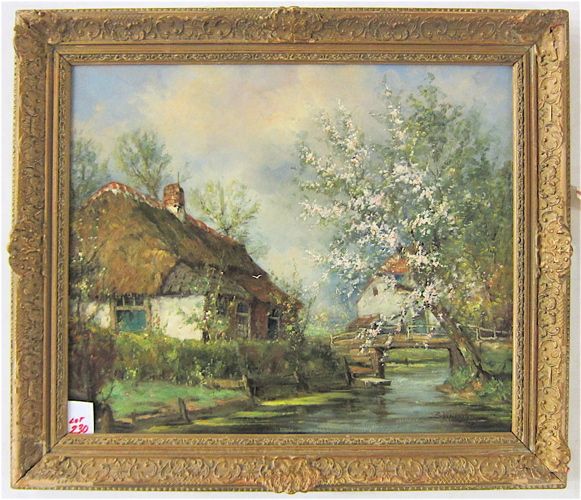 Summer landscape with thatched roof cottage, stream and blossoming trees.