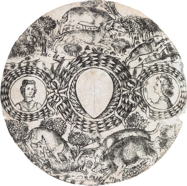 | Two Heads in Medallions and Two Hunting Scenes. | |