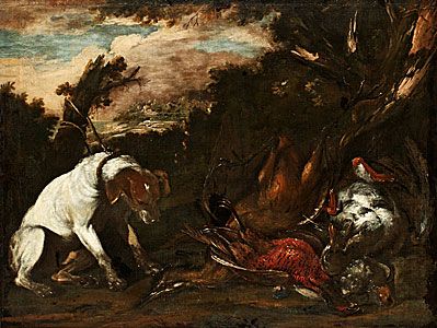 STILLEBEN MED JAKTHUND OCH FÅGLAR.