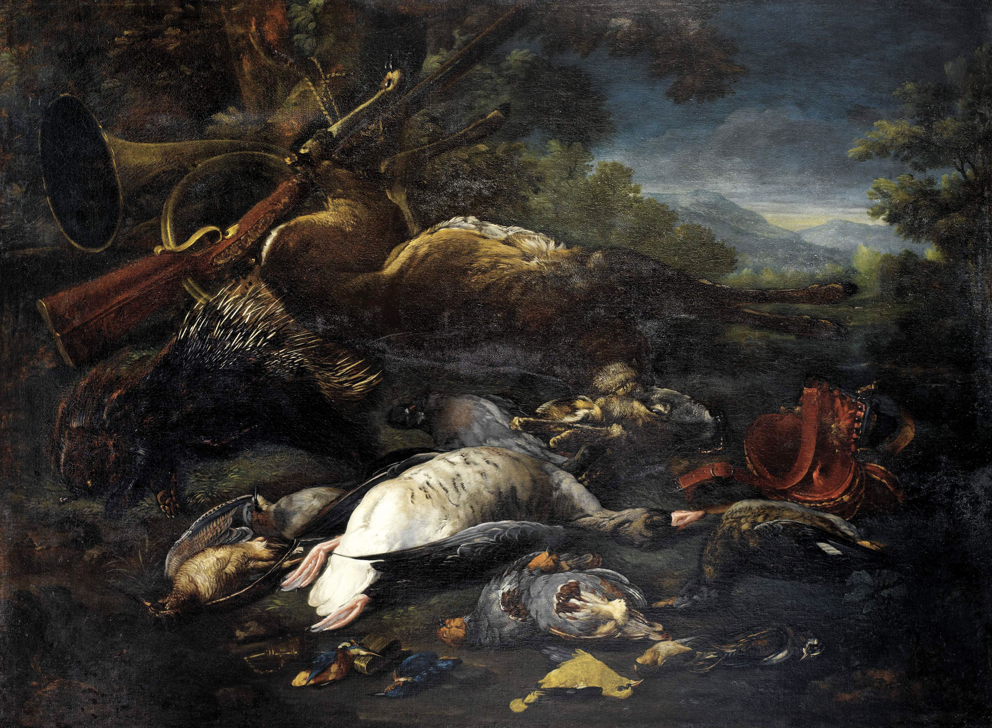 | NATURE MORTE AUX TROPHÉES DE CHASSE ET PORC-ÉPIC | |
