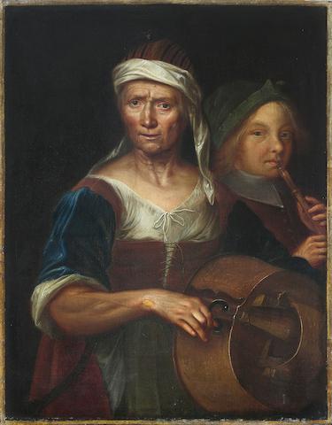 | An elderly lady playing the hurdy-gurdy with a young boy playing a flute | |