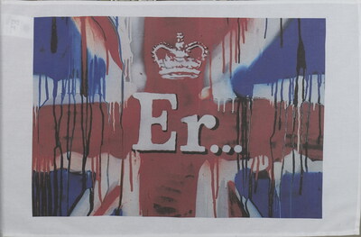 BANKSY (né en 1974) - Er (Union Jack Tea Towel) - 2012 - Tissu imprimé - Sur étiquette marquée "Not made in England" - Edition imitée sur 1000 exemplaires, seulement 400 exemplaires ont été numérotées - 41 x 63 cm | |