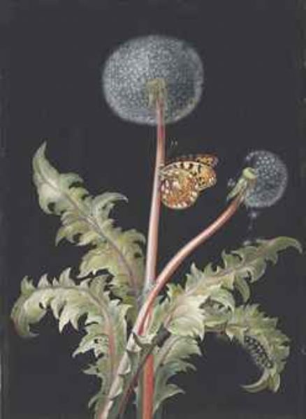 | A dandelion plant in seed with a butterfly, dragonfly and caterpillar | |