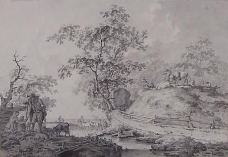 Rural scene with animals and figures by a river