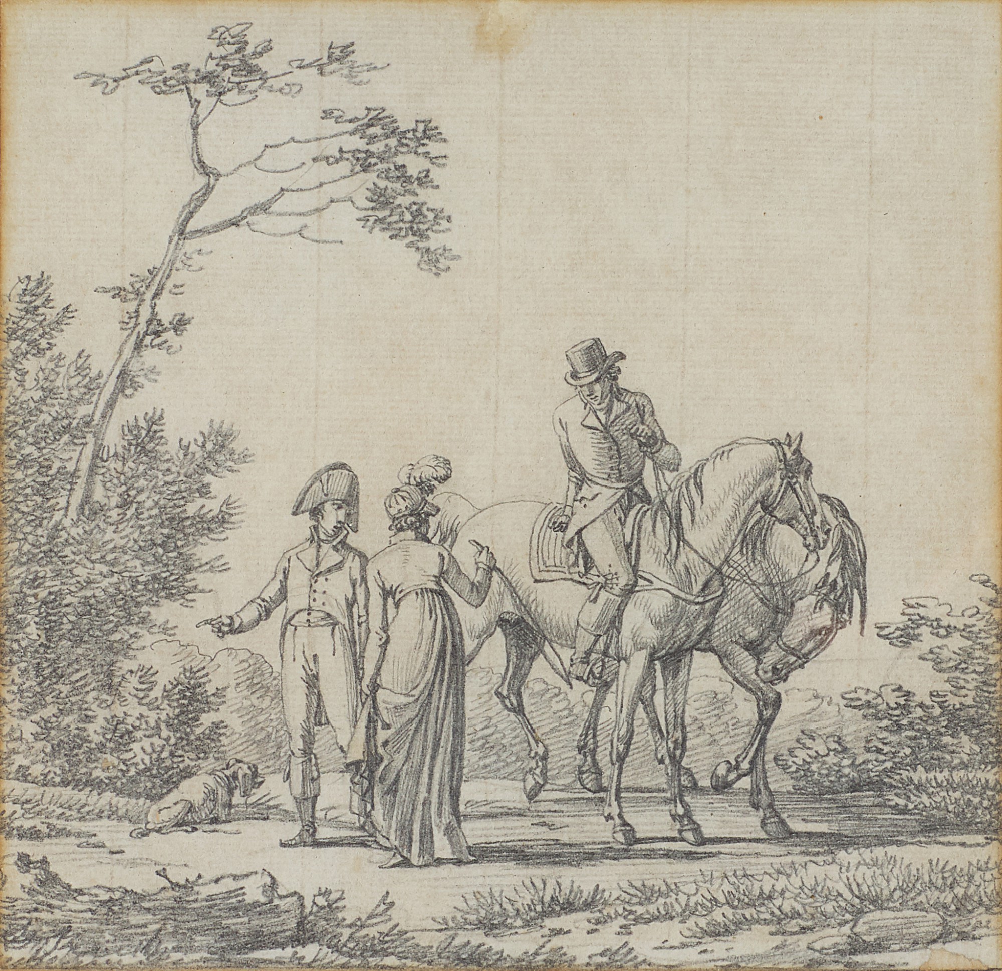 | A gentleman on horseback conversing with a lady and an officer in a landscape | |