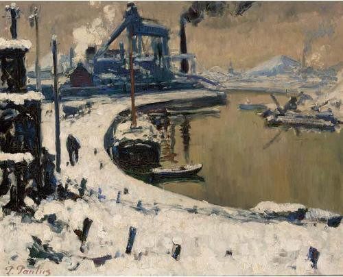 AN INDUSTRIAL AREA WITH A MOORED BOAT IN WINTER