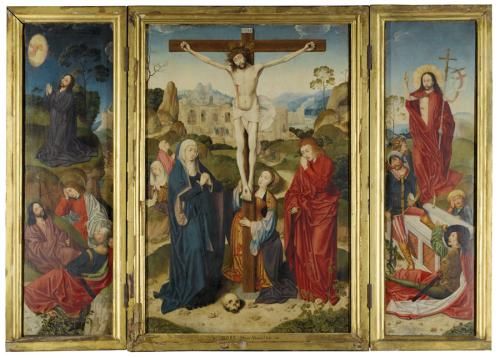 | A TRIPTYCH REPRESENTING THE CRUCIFIXION, FLANKED BY THE AGONY IN THE GARDEN AND THE RESURRECTION, WITH SCENES FROM THE PASSION B | |