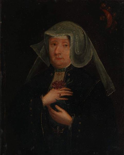 | Dreiviertelbildnis einer Patrizierfrau im schwarzem, mit goldbesticktem Mantel und weißer Haube | |