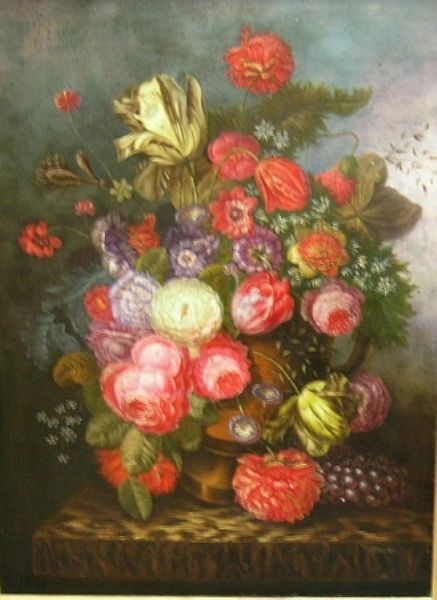 ELABORATE FLORAL STILL LIFE ON A LEDGE: TWO