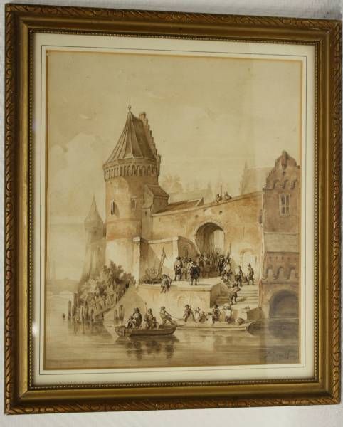 Figuren bij oud Hollandse stadspoort aan het water