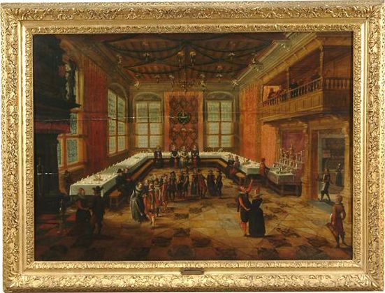 | Elegant figures congregating in a banqueting hall | |