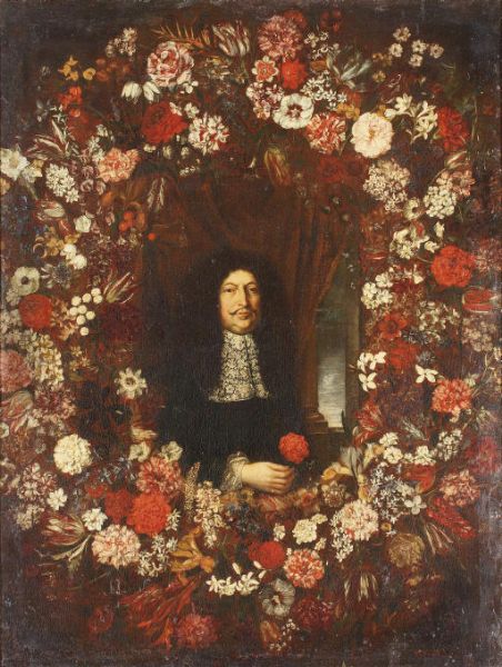 A portrait of a gentleman surrounded by a garland of mixed flowers