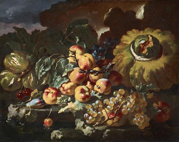 A melon, peaches, grapes and other fruit on a stone ledge, before a stream
