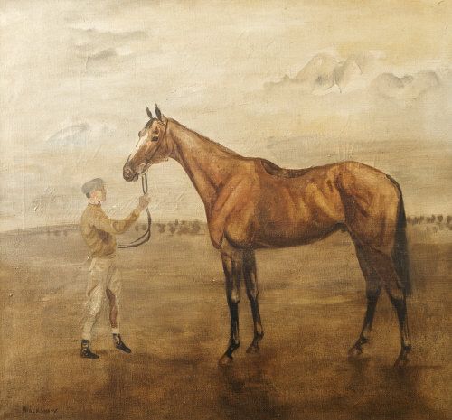 Portrait of a racehorse with groom