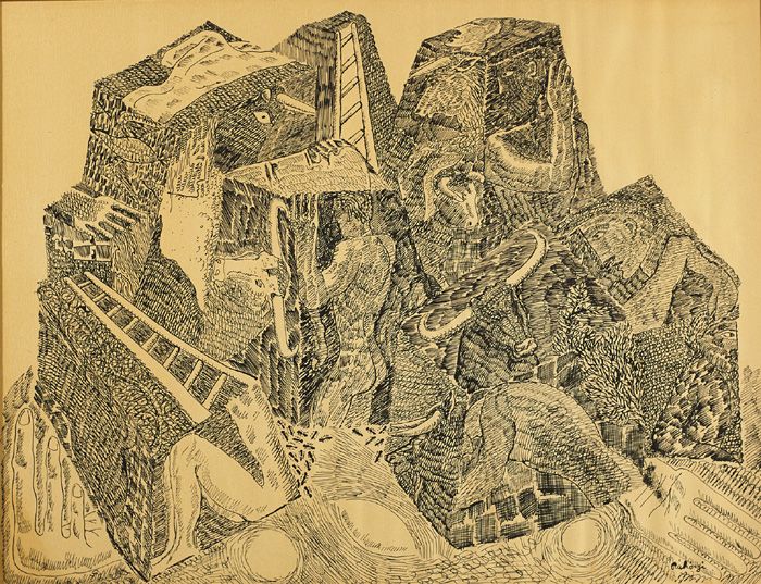 | EVOLUTION CREATURE, 1949 and TWO FIGURES IN A LANDSCAPE WITH ROMAN COLUMNS (A PAIR) | |