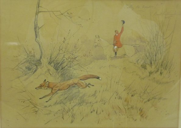 Tally Ho Over! a fox escaping with huntsman waving him on