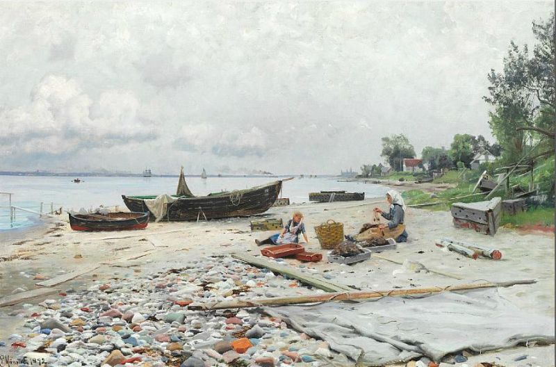 Beach scene from Hellebæk with a view to Helsingborg and Kronborg