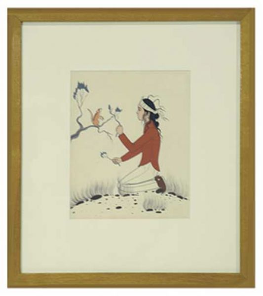 A young Navajo boy entertaining a squirrel in a tree