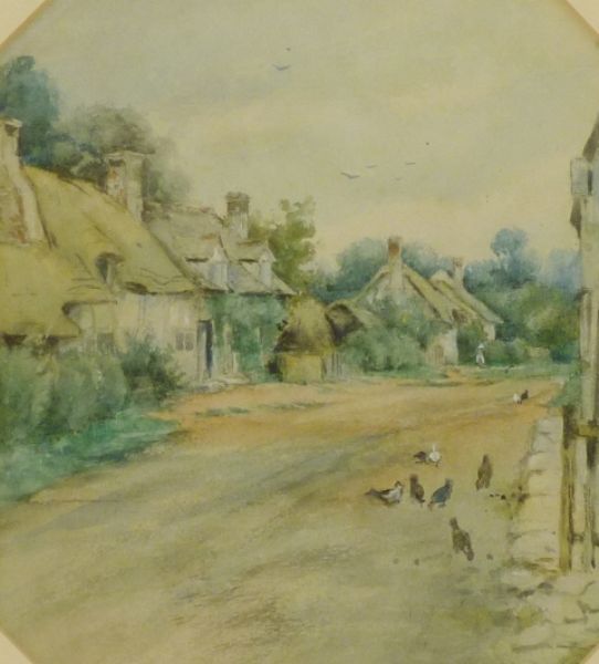 | A street scene of Station Road, Salford Priors near Bidford-on-Avon with thatched cottages, figures and chickens | |