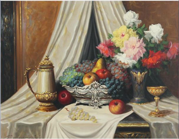 Still life with flowers and fruit.
