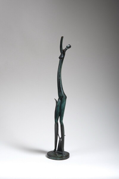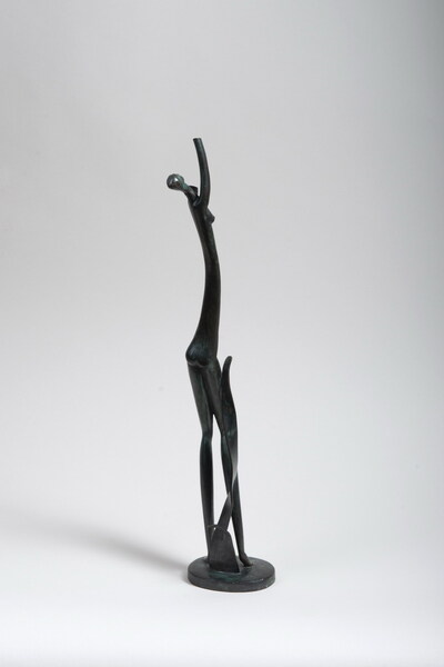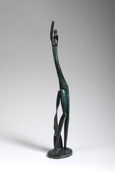 Bela VOROS (1889-1979) - Jeune femme aux bras levés, 1945 - Sculpture hiératique en bronze patiné vert et noire. Monogramée sur la terrasse. Sans cachet de fondeur ni de tirage (probablement tirage unique). 41,5 cm hors socle - 42,5 cm avec socle | |