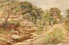 River landscape with figure and cottage and bridge over a stream