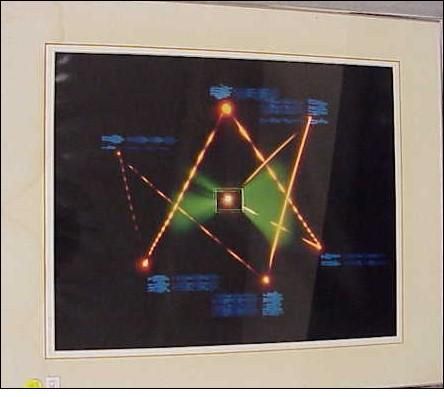 | figures in silhouette with rays of light between each group and light in center within transparent box | |