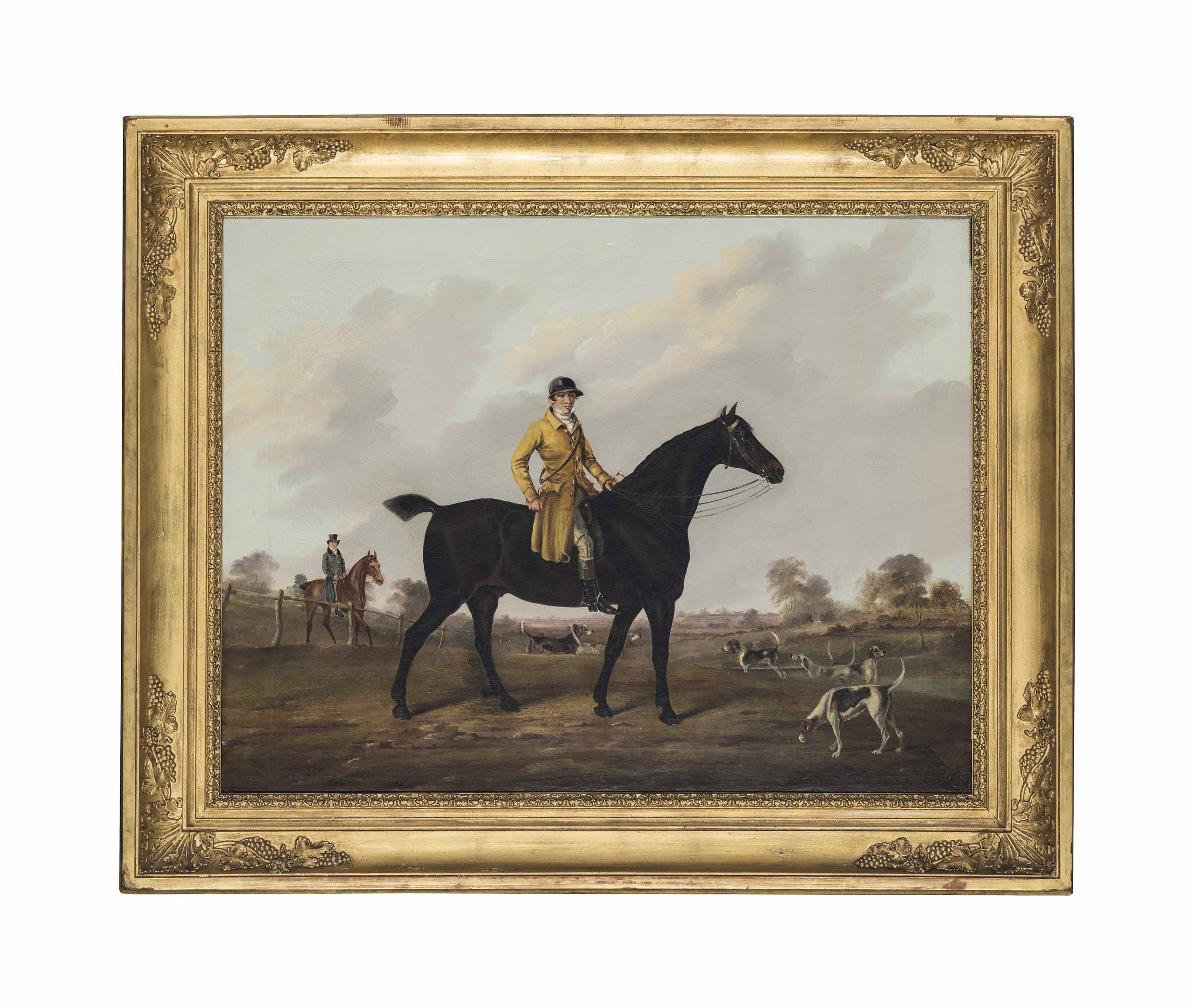 | A huntsman on a chestnut hunter, with hounds and a huntsman beyond, in an extensive landscape | |