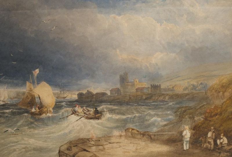 FIGURES ON A JETTY OVERLOOKING A BOAT ROWING OUT